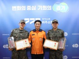 파주소방서는 27일 화재 초기진압 유공자인 1군수지원여단 91정비대대 소속 이성표 중사, 곽수민 일병에게 표창장을 수여했다.