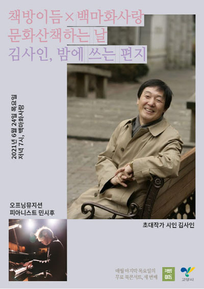 프로그램의 초대 작가인 김사인 시인은 1981년 ‘시와 경제’ 동인 결성에 참여하면서 시를 발표하기 시작했고 1982년 무크 ‘한국문학의 현단계’ 1집을 통해 평론도 쓰기 시작했다. 출간한 시집은 ‘밤에 쓰는 편지’, ‘가만히 좋아하는’등이 있고, 현대문학상, 대산문학상, 서정시학 작품상 등을 수상했다.