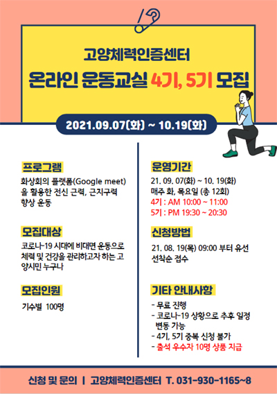 오는 9월 7일부터 10월 19일까지 6주간 화상회의 플랫폼 앱인 구글 미트(Google Meet)를 활용해 4기(화·목 오전 10시 ~ 11시), 5기(화·목 오후 7시 30분 ~ 8시 30분) 두 개의 기수로 나누어 운영되며, 이번에 모집하는 운동교실은 고양체력인증센터 전문 강사진과 실시간으로 소통하며 맨몸 운동과 소도구를 활용한 운동 등 기본 근력운동 프로그램을 주제로 진행된다.