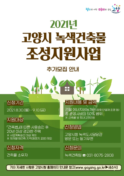 고양시가 노후주택의 에너지효율 향상과 시민의 주거환경 개선을 위한 “2021년 녹색건축물 조성 지원 사업” 대상자를 내달 10일까지 추가 모집한다.