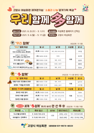 모든 강좌가 무료인 ‘우리함께 多함께’는 8월 25일부터 고양시 여성회관 홈페이지(wcenter.goyang.go.kr)에서 선착순으로 접수받는다. 다만 랜선투어는 팀별(가족별) 5천원의 참가비가 있다.