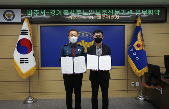 파주경찰서는 지난21일 경기북서부 노인보호전문기관(이하 북서부 노보전)과 ‘학대피해 노인의 보호·지원을 위한 업무협약’을 체결했다.