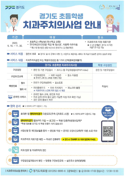 대상 학생은 ‘덴티아이경기’ 앱을 내려 받아 온라인 교육을 이수하고 문진표를 작성한 뒤 고양시 홈페이지 게재 또는 학교에서 배부한 학부모 안내문에서 확인한 지정 의료기관(치과)에 사전 전화 예약 후 방문하면 된다.
