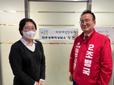 한편 조 후보는 성폭력 없는 파주, 아이, 청소년이 맘 놓고 웃을 수 있는 파주를 위해 여성민우회와 지속적인 교류를 이어가기로 하는 한편 시장이 되면 제일먼저 성인지감수성 교육을 받겠다고 말했다.