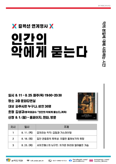 파주시 교하도서관은 오는 8월 11일부터 25일까지 매주 목요일 교하도서관 2층 문화강연실에서 ‘인간의 악에게 묻는다’의 저자 김성규 작가를 초청해 인문학 강연을 운영한다고 밝혔다.