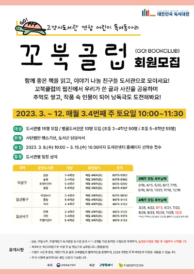 꼬북클럽 회원접수는 3월 8일 오전 10시부터 3월 15일 오후 4시까지 고양시도서관센터 홈페이지에서 할 수 있으며 기타 자세한 사항은 독서진흥팀(☎031-8075-9019)으로 문의하면 된다.