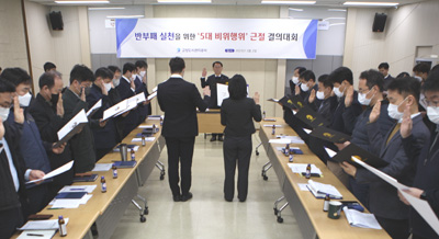 이번 결의대회는 공직사회 부패행위 방지 및 안전사고를 예방하고자 기관장의 특별한 의지를 담아 ▲ 금품수수 등 부정·부패 행위 ▲ 조직내 성희롱·성폭력 행위 ▲ 음주운전 ▲ 지위와 권한을 남용한 갑질 행위 ▲ 안전관리 소홀에 의한 중대재해 사고 등 5대 비위행위에 대한 근절 의지를 담아냈다.