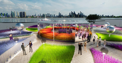 2. 주제정원 ‘미술품으로서의 정원’주제정원은 꽃과 함께하는 순간의 기억을 테마로 조성되는데, 꽃박람회와 국립현대미술관이 협업하여 기획한 설치 미술과 예술성이 가미된 신개념 정원으로 ‘모멘텀 가든’으로 표현된다. 변화하는 시간 속에서 꽃과 함께한 삶의 행복과 환희의 순간을 정원으로 연출하였다. 지름 20m, 높이 4m의 꽃이 무한히 반사되는 미러 파빌리온, 반사구 15개와 투명구 6개의 공기막 구조물, 63m의 미러폴 펜스 등 다양한 미술품으로 구성된다.