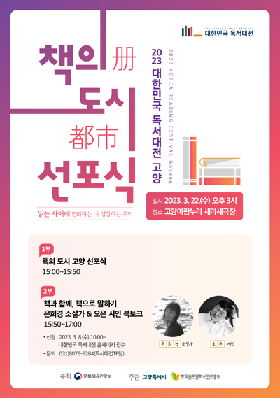 고양특례시가 오는 3월 22일 오후 3시 아람누리 새라새 극장에서 국내 최대 독서문화축제 ‘2023 대한민국 독서대전’의 ‘책의 도시, 고양’ 선포식을 개최한다.