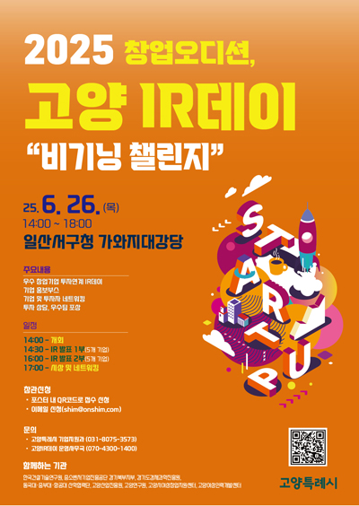 고양특례시는 오는 26일 일산서구청 가와지 대강당에서 창업오디션‘2025년 상반기 고양 아이알(IR)데이’를 개최한다고 밝혔다.