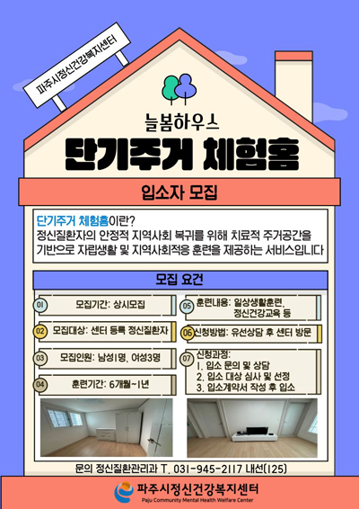 파주시정신건강복지센터(이하 ‘센터’)는 2026년 3월 시행 예정인 「통합돌봄지원법」 취지에 따라 정신질환자의 자립과 회복을 지원하기 위해 ‘단기주거체험홈 늘봄 하우스’ 입소자를 모집한다고 밝혔다.