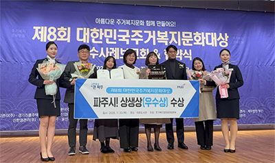 파주시가 지난 20일 2025년도 ‘제8회 대한민국주거복지문화대상’ 시상식에서 기관 부문 상생상(우수상)을 수상했다고 밝혔다.