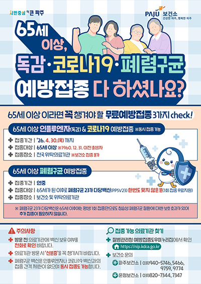 파주시는 겨울철 호흡기 감염병 확산에 대비해 65세 이상 어르신을 대상으로 독감(인플루엔자), 코로나19, 폐렴구균 예방접종 3종을 안내하며 접종 참여를 당부했다.