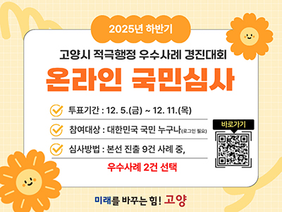 고양특례시는 오는 12월 15일 ‘2025년 하반기 고양시 적극행정 우수사례 경진대회’에서 시민 행복을 위해 적극행정을 펼친 우수공무원과 산하 공공기관 우수직원을 선발한다.