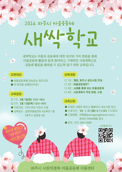 파주시가 오는 211일까지 주민들의 마을공동체 활동 입문을 돕는 ‘2026 파주시 마을공동체 새싹학교교육생을 모집한다.