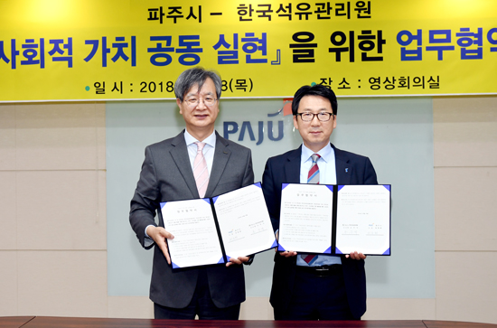 최종환 시장은 “파주시가 한국석유관리원과 함께 사회적 가치를 공동실현 할 수 있어 매우 기쁘다”며 “양 기관의 돈독한 협력이 파주시가 안전하고 행복한 도시로 거듭나는 좋은 성과로 이어지길 바란다”고 말했다.
