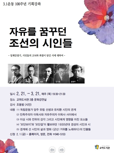 파주시 교하도서관은 3.1운동 및 임시정부 수립 100주년을 맞아 오는 21일부터 3월 21일까지 매주 1회 ‘자유를 꿈꾸던 조선의 시인들’ 기획 강좌를 진행한다.