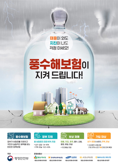 풍수해보험은 행정안전부가 주관하고 5개 민영보험사(DB손해보험,현대해상,삼성화재, KB손해보험,NH농협손해보험)가 운영하는 정책보험으로 태풍, 대설, 지진 등 자연재난으로 피해를 볼 경우 손해를 보상해주는 제도다.