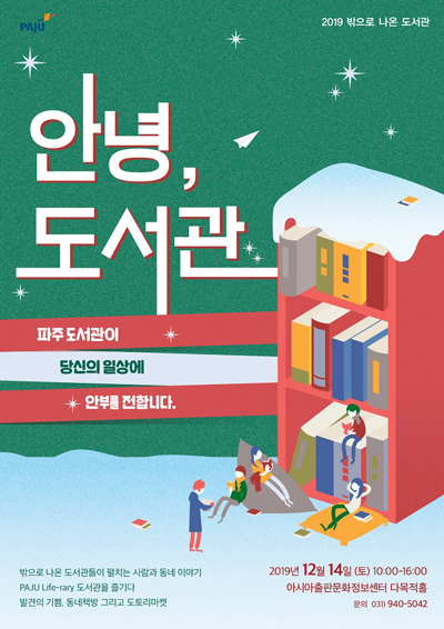 파주시는 책 읽는 즐거움을 전달하기 위해 ‘2019 파주 밖으로 나온 도서관’을 오는 14일 파주출판도시 아시아출판문화정보센터 다목적홀에서 개최한다.