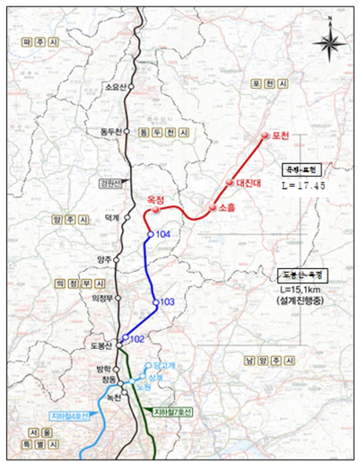 한편, 옥정~포천선의 선행구간인 7호선 연장 ‘도봉산~옥정 광역철도 건설공사’는 총 6,412억 원을 투입해 도봉산역에서 장암역, 의정부경전철 탑석역을 거쳐 양주 고읍·옥정지구를 잇는 15.3㎞의 철도를 신설하는 사업으로 지난달 공사에 들어간 바 있다.