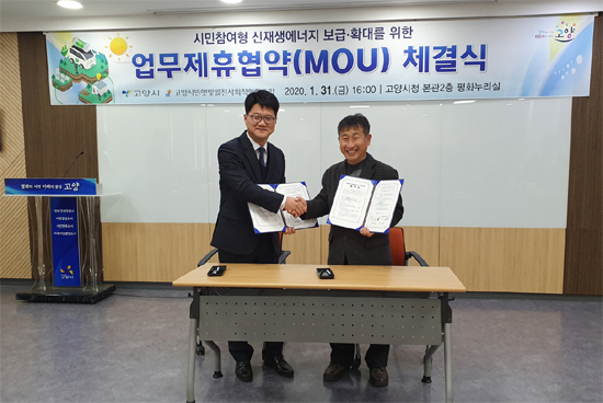 고양시는 지난 31일 시청 평화누리실에서 한찬희 기후환경국장, 박평수 고양시민햇빛발전사회적협동조합 이사장, 조현숙 고양시의회 환경경제위원장 등 30여명이 참석한 가운데 시민참여형 신재생에너지 보급·확대를 위한 업무제휴협약(MOU)을 했다고 밝혔다.