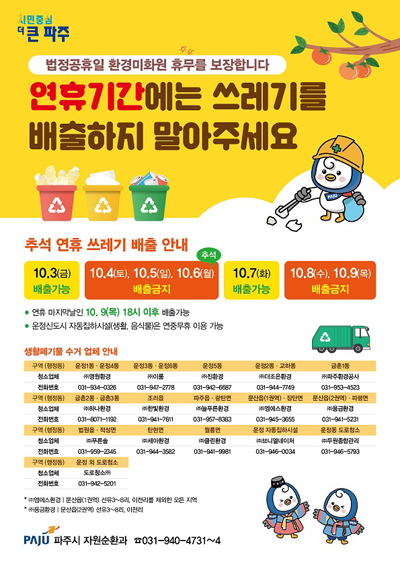 파주시는 환경미화원 휴무 보장을 위해 추석 연휴 기간인 10월 4일부터 10월 6일, 10월 8일부터 10월 9일까지는 생활폐기물을 배출해서는 안 되며, 이 기간 동안에는 생활쓰레기 수거가 중단된다고 밝혔다.