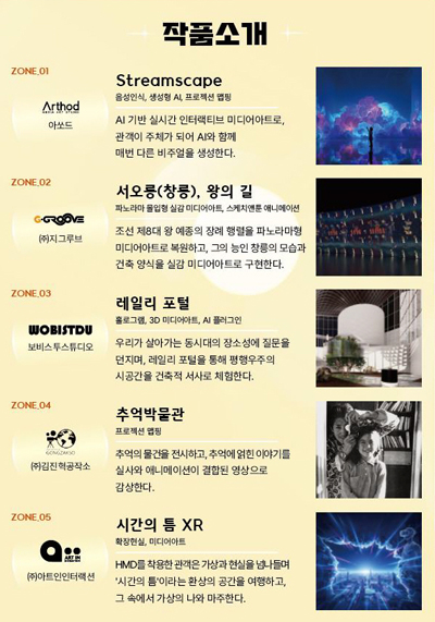 이번 전시는 ▲AI(인공지능) 기반으로 실시간 관객과 상호작용하는 미디어아트 ‘Streamscape’(아쏘드) ▲조선 제8대 왕 예종의 장례 행렬을 파노라마 형식 미디어아트로 복원한 ‘서오릉, 왕의 길’(㈜지그루부) ▲홀로그램과 3D 미디어아트로 평행우주 시공간을 체험하는 ‘차원의 문 : 레일리 포털’(보비스투스튜디오) ▲추억의 물건 전시와 실사, 애니메이션이 결합된 영상을 감상하는 ‘추억박물관’(㈜김진혁공작소) ▲HMD(머리에 착용하는 디스플레이)를 착용하고 현실과 가상 세계를 넘나드는 ‘시간의 틈 XR’(㈜아트인인터랙션) 등이다.