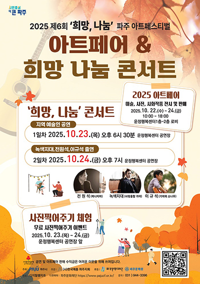 파주시가 주최하고 ㈔한국예술문화단체총연합회 파주지회(이하 ‘파주예총’)에서 주관하는 ‘2025 제6회 ‘희망, 나눔’ 파주 아트페스티벌‘이 10월 22일부터 24일까지 3일간 운정행복센터에서 개최된다.