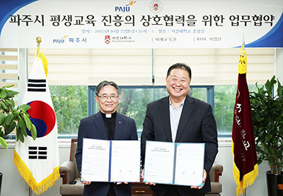 파주시는 지난 22일, 서강대학교 본관에서 김경일 파주시장과 서강대학교 심종혁 총장 등이 참석한 가운데 서강대학교와 2026년 ‘일생일대 프로젝트’를 공동 기획·운영하기 위한 평생교육 진흥 업무협약을 체결했다고 밝혔다.