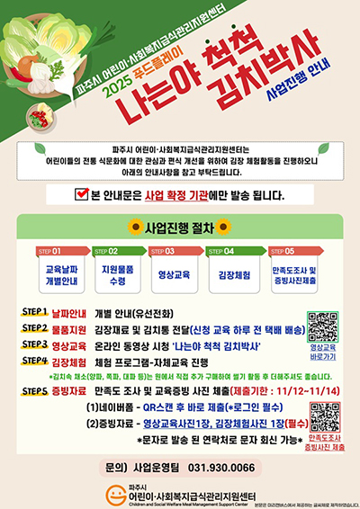 파주시 위탁기관인 파주시 어린이·사회복지급식관리지원센터(센터장 김장호)는 오는 12일부터 14일까지 관내 어린이 급식소를 대상으로 전통 김장 문화를 배우고 직접 체험하는 활동 ‘나는야 척척 김치 박사’를 운영한다고 밝혔다.