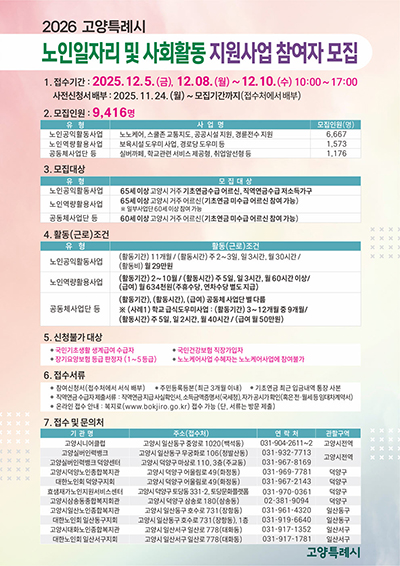 고양특례시는 2026년 노인일자리 및 사회활동지원 사업에 총 382억원을 투입해, 노인일자리 참여자 9,416명을 수행기관별 통합 모집한다고 밝혔다.