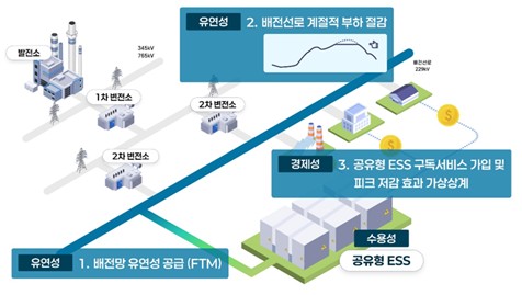공유형 ESS는 배전선로 과부하를 완화하여 정전 등 전력 재난을 예방하고, 가상상계제도(VNM)를 활용해 다수의 수용가의 전기요금을 절감함으로써 신규 수익 창출이 가능한 지역 기반 에너지 플랫폼 모델이다.
