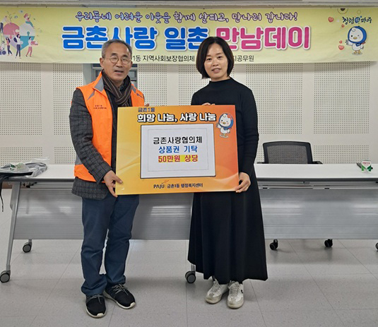 파주시 금촌1동은 지역사회보장협의체(금촌사랑협의체)가 연말을 맞아 저소득 취약계층을 지원하기 위해 50만 원 상당의 상품권을 기탁했다고 밝혔다.