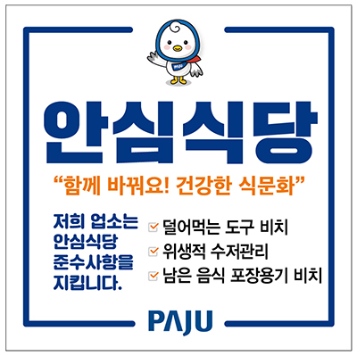 안심식당은 식사 문화 3대 개선 과제인 ▲덜어 먹기 가능한 도구 비치 및 제공 ▲위생적인 수저 관리 ▲남은 음식 포장 용기 비치 여부를 모두 충족하는 음식점이며, 파주시는 현재 200개소를 안심식당으로 지정해 운영 중이다.