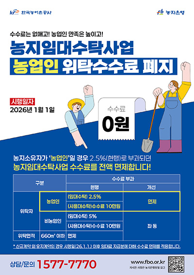 한국농어촌공사(사장 김인중, 이하 ‘공사’)는 2026년 1월 1일부터 농업인을 대상으로 ‘농지임대수탁사업’의 위탁수수료를 전면 폐지한다고 밝혔다.