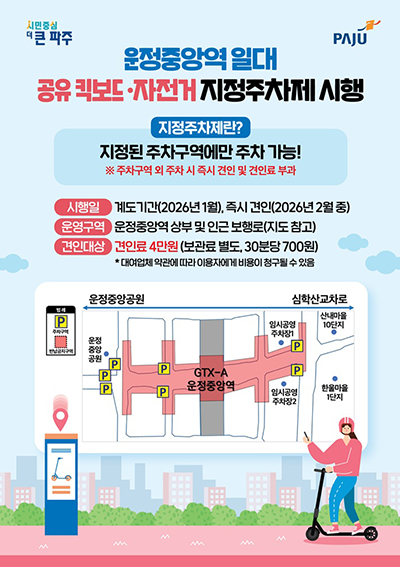 시는 지정주차제의 운영을 위해 기존 운정중앙역 상부에 설치돼 있던 주차구역 2개소를 철거하고, 운정중앙역 인근에 신규 주차구역 7개소를 설치해 이용자들이 기기를 반납할 수 있는 공간을 확보했다.