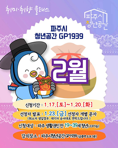 파주시청년공간 지피(GP)1939가 오는 2월 한 달간 청년을 위한 맞춤형 프로그램에 참여할 참여자를 모집한다.
