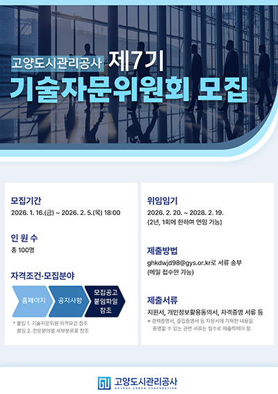 고양도시관리공사(사장 강승필)는 도시개발사업의 전문성과 공공성 강화를 위해 제7기 기술자문위원회 위원을 공개 모집한다고 20일 밝혔다.