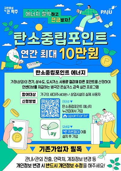 기존 탄소중립포인트제 참여자는 주소 등 개인정보에 변동이 있을 경우, 인터넷을 통해 직접 수정하거나 파주시 기후위기대응과(☎031-940-3791)로 통보해 수정해야만 보상금을 지급받을 수 있다.