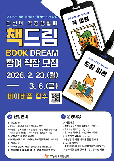 ‘책드림(Book Dream)’ 사업 참여를 희망하는 기업체는 네이버 폼을 통해 신청할 수 있으며, 자세한 문의는 고양시 도서관센터 독서진흥팀(☎031-8075-9019)으로 하면 된다.