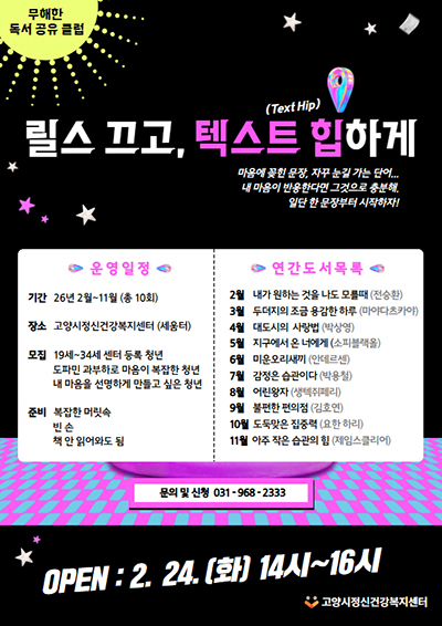 고양시정신건강복지센터(센터장, 이정석)는 만19~34세 등록청년을 대상으로 ‘무해한 독서 공유 클럽’(릴스 끄고, 텍스트 힙하게)을 매달 운영한다.