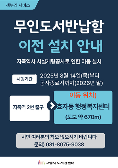 또한 지난해 8월부터 실시한 지축역 노후 역사시설 개량공사와 관련해 무인도서반납함을 효자동 행정복지센터로 이전 설치했다. 공사 기간에도 시민들이 불편 없이 책누리 서비스를 지속 이용할 수 있도록 할 계획이다.