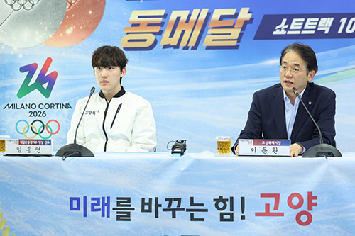 고양특례시는 27일 오후 2시 시청 대회의실에서 ‘2026 밀라노-코르티나 동계올림픽’ 쇼트트랙 메달리스트인 고양시청 빙상팀 임종언 선수의 성과를 축하하는 환영 기자회견을 개최했다.