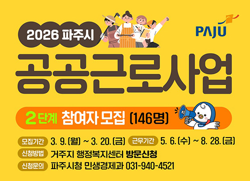 파주시가 오는 20일까지 2026년 2단계 공공근로사업 참여자 146명을 모집한다.