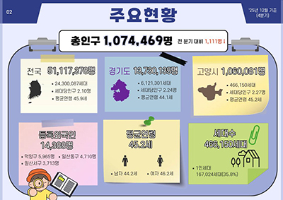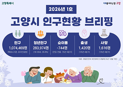 고양특례시가 저출생·고령화 등 급변하는 인구구조 변화에 선제적으로 대응하기 위해 ‘고양시 인구현황 브리핑’을 운영한다. 시는 인구 규모와 연령구조, 출생·사망, 인구이동 등 주요 지표를 행정동 단위까지 세분화해 인포그래픽으로 시각화하고, 이를 시청 홈페이지 행정자료방을 통해 정례적으로 공개할 계획이다.