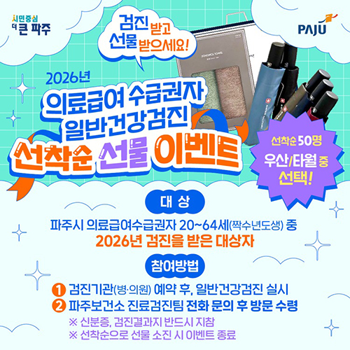 검진 희망자는 가까운 일반건강검진 지정 의료기관에 사전 예약한 후 신분증을 지참해 방문하면 된다. 검진 후 결과지와 신분증을 지참해 파주보건소 진료검진팀으로 찾아오면 선물을 받을 수 있으며, 방문이 어려운 경우 택배 수령도 가능하다.