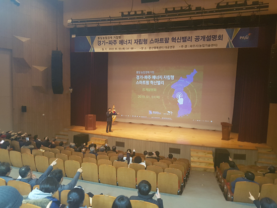 파주시는 지난 3일 문산행복센터 대강당에서 지역주민과 시설원예농가, 농민단체장, 스마트팜 기술 관련사업 업무 관계자 등 150여명이 참석한 가운데 통일 농업경제 거점 경기-파주 에너지자립형 스마트팜 혁신밸리조성사업에 대한 공개설명회를 개최했다.