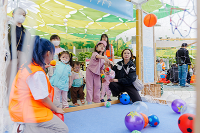 ‘컬러풀 올림픽 존’은 도전, 존중, 연대의 가치를 담아 총 8가지 놀이 체험이 펼쳐진다. 색깔별로 나눠진 공간에서는 신문지 공, 블록, 트램펄린 등을 활용해 목표를 달성하는 신체활동에 참여할 수 있다.